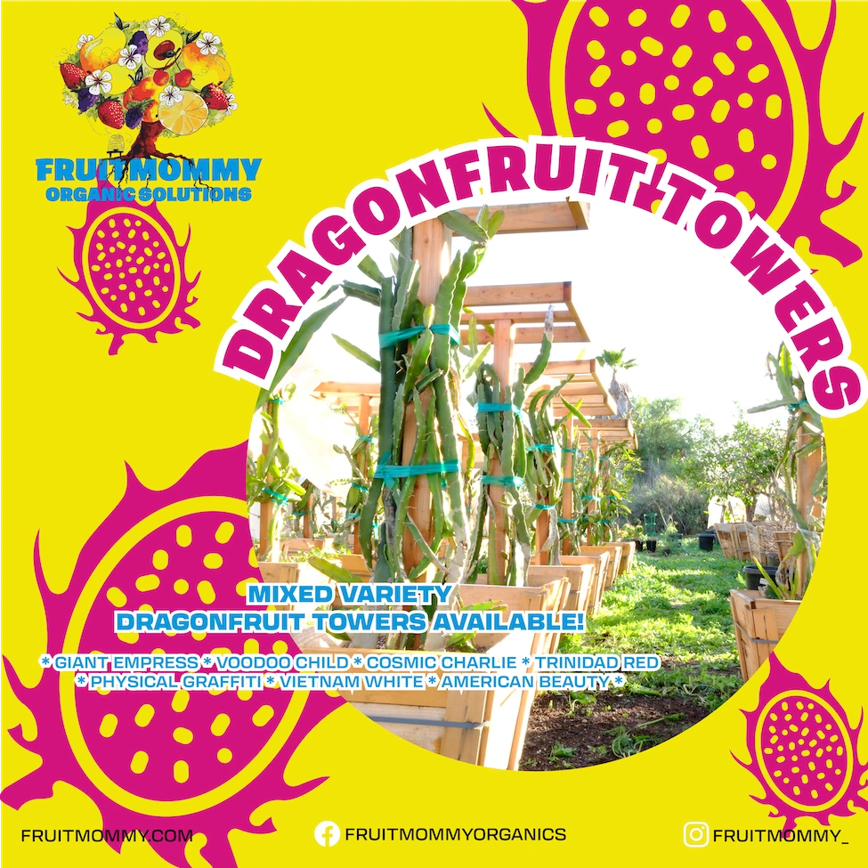 Our towers come with several varieties of dragonfruit for maximum pollination and many varieties are extremely rare coming from an older grove of hidden rare beauties!